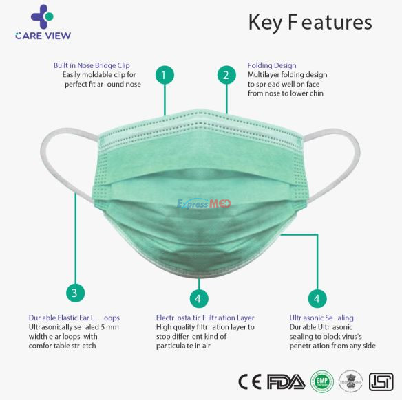 Care View 3 Ply Disposable Protective Surgical Face Mask Green