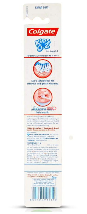 Colgate Kids Toothbrush, imprinted with amusing cartoon characters, is a fun way to encourage good oral care habits early on! This attractive toothbrush has extra soft bristles specially designed for children. It is ideal for kids between 0-2 years of age, who are learning to brush.