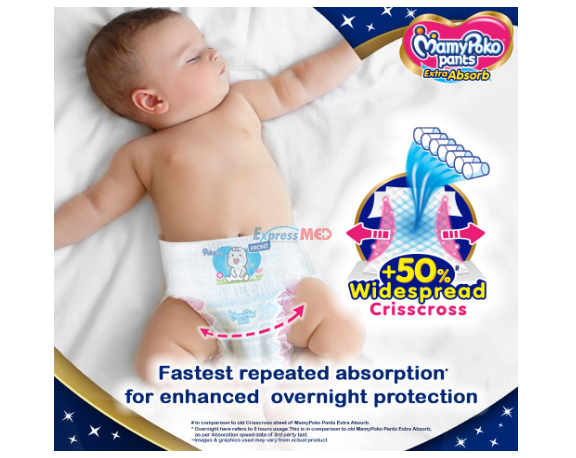 Prevents overnight dryness to give uninterrupted sleep Has an all-round elastic white band and is gentle on the baby's skin Helps prevent thigh leakage Provides 12 hours of absorption to keep your baby dry longer