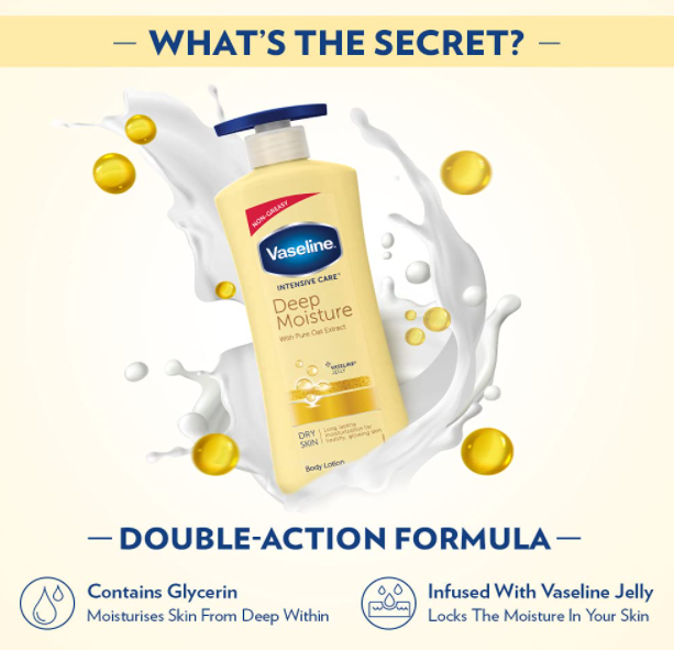 - Vaseline Intensive Care Deep Restore Body Lotion moisturizes dry skin from the first application